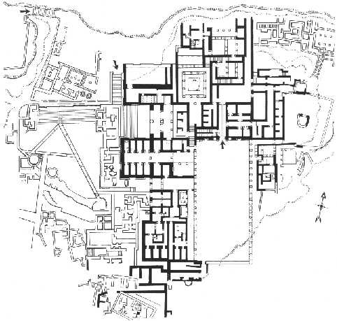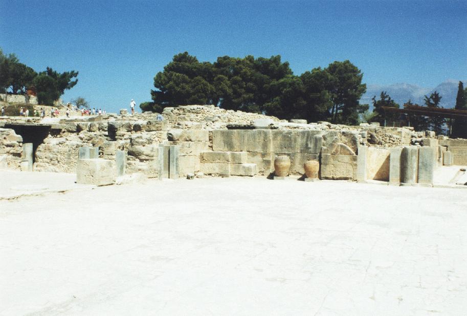 Ein erster Palast wurde um 2.000 v.Chr. erbaut. Wie auch die anderen minoischen Paläste, fiel er wahrscheinlich um 1.700 v.Chr. einem Erdbeben zum Opfer, wurde jedoch ebenfalls wieder neu aufgebaut. Obwohl die meisten Überreste vom neuen Palast stammen, sind auch noch vereinzelt Spuren des alten Palastes zu finden. Von den ursprünglich um den Zentralhof erbauten Palasttrakten sind nur noch Reste des West- und Nordflügels erhalten. Die beiden anderen Flügel wurden, vermutlich bei einem zweiten Erdbeben, um 1.450 v.Chr. vollständig zerstört. Markant ist eine 13,75 m breite und 20 m lange Freitreppe aus der Altpalastzeit im Westen der Anlage. Von ihren Stufen aus konnten die Gäste den kultischen Zeremonien wie in einem Theater zusehen. |