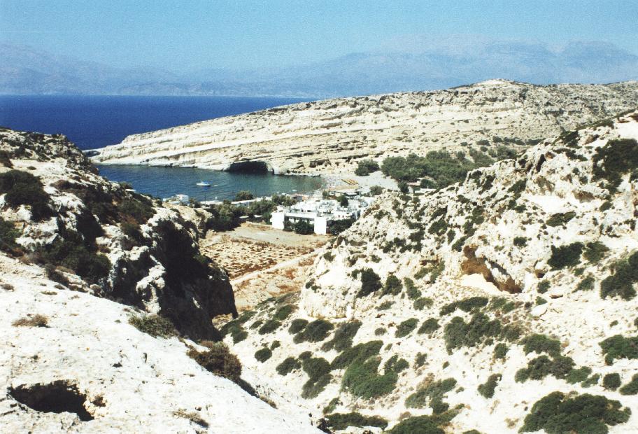 In der Mythologie ist Matala der Ort, an dem Zeus in Gestalt eines weißen Stiers mit der geraubten Königstochter Europa an Land ging und dann Richtung Gortys verschwand. Zur Zeit der Minoer war Matala der zweite Hafen von Festos. Viele Jahrhunderte später, nach der Zerstörung des Palastes von Festos, wurde Matala um 220 v.Chr. der Hafen von Gortys. Etwa seit 1970 wird das einstige Fischerdorf immer mehr vom Tourismus geprägt. Der Dorfkern besteht heute überwiegend aus Tavernen, Bars, Läden einer kleinen Marktstraße und Hotels. |