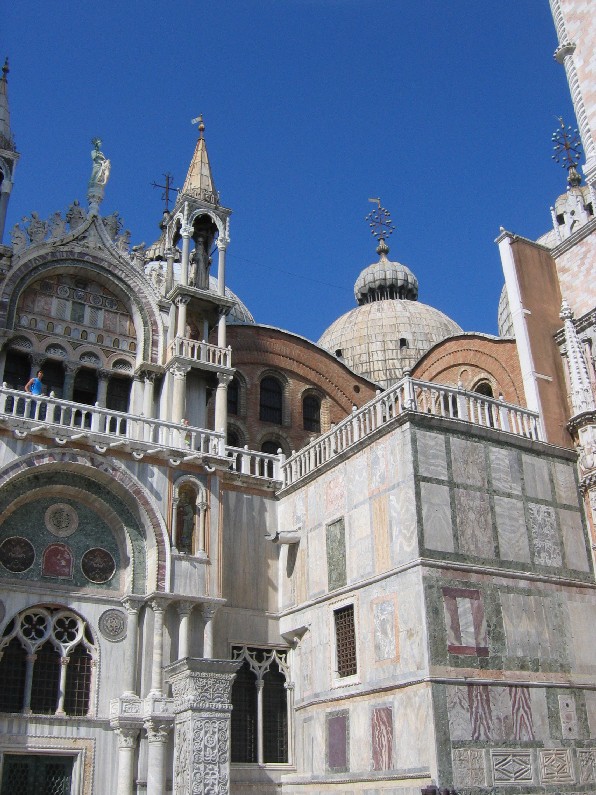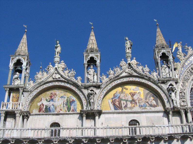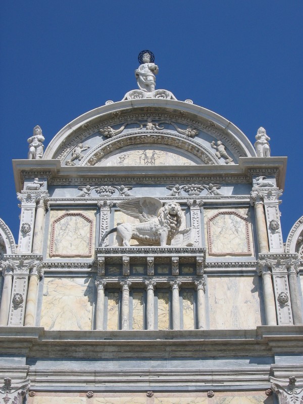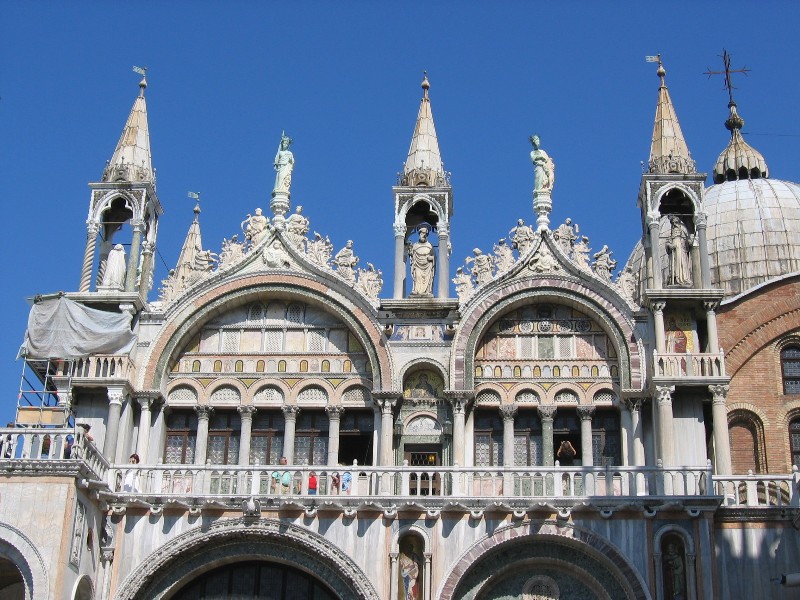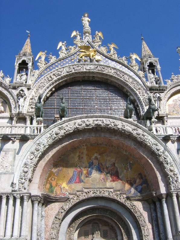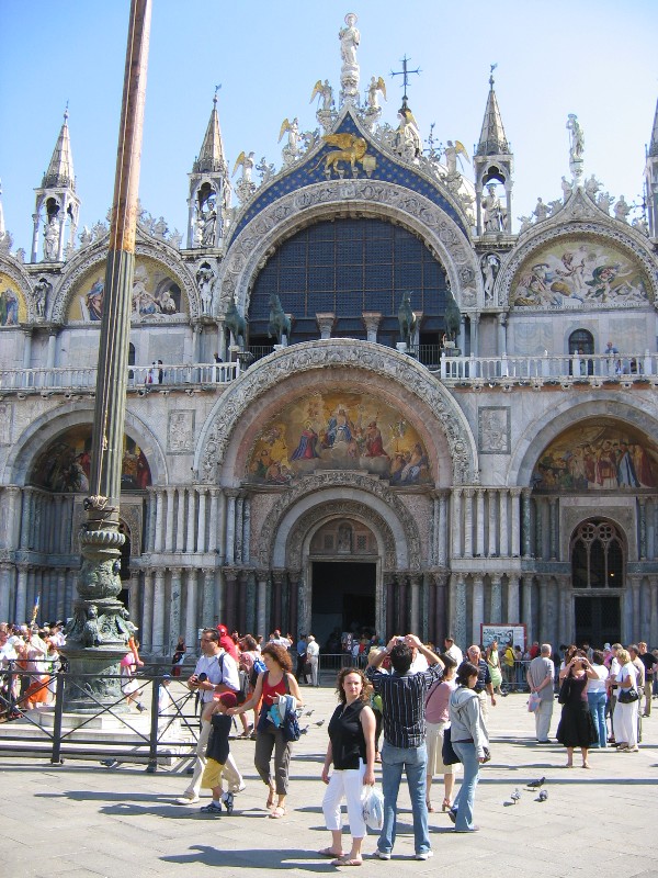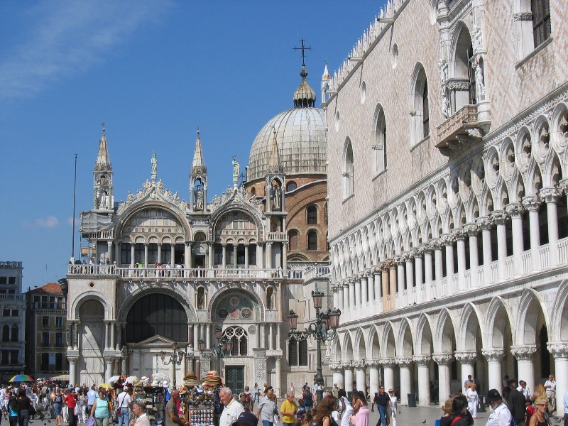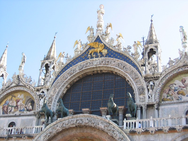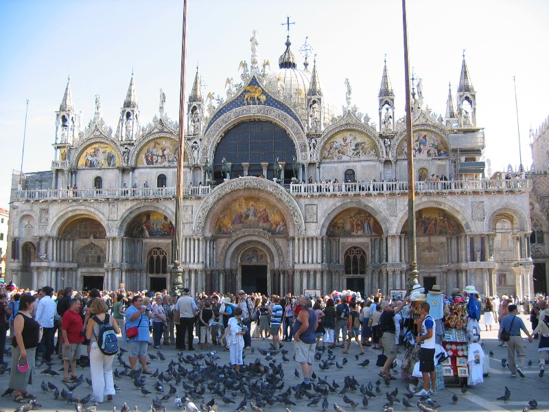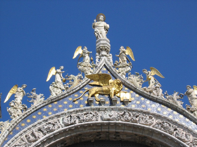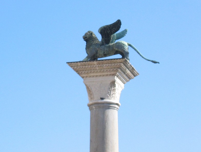 | Warum liegt Venedig auf dem Wasser? Das hängt mit der Völkerwanderung zusammen. Die Germanen sowie viele andere Völker, die zu dieser Zeit auf der Suche nach einem besseren Land nach Süden zogen, stießen letztendlich in Oberitalien auf die Römer. Die Leute, die in der Nähe von Venedig auf dem Festland wohnten, versteckten sich, um der Gewalt des Aufeinandertreffens zu entgehen. Sie zogen auf die vorgelagerten Inseln. Die heranziehenden Völkerstämme entdeckten sie nicht und zogen vorbei, in Richtung Rom. Das Römische Reich war groß. Als das Weströmische Reich zerschlagen war kam Venedig zum Oströmischen Reich mit der Hauptstadt Byzanz, die war weit weg. Die Venezianer erhielten deshalb einen Führer, den Dogen. Im 8. Jh. wollte der Papst die Macht über Oberitalien erreichen. Dabei wurde er vom Frankenkönig Karl dem Großen unterstützt. Für seine Unterstützung erhielt Karl die römische Kaiserkrone. Auch sein Sohn Pippin erhielt sie später. Doch die Venezianer wollten nicht vom Papst beherrscht werden. Als der Papst Pippin mit einem Heer schickte zogen sich die Venezianer noch weiter zurück, auf kleine Inseln in der Nähe des Lido. Dabei nutzten sie die dort auftretenden Strömungen aus. Von diesen hatte jedoch Pippin keine Kenntnis und wäre fast mit seinen Schiffen untergegangen. So gab Pippin auf. Die Venezier blieben in der Lagune und bauten die Inseln aus. Sie hoben Land aus um die Inseln zu erhöhen. Durch das Ausheben entstanden Kanäle wie der Canal Grande. Ab dieser Zeit wählten die Venezianer bis zum Ende des 18. Jh auch ihren Dogen selber. Tausend Jahre war Venedig eine Republik, mit immer neu gewähltem Dogen. Diese Regierungzeit ist unter dem Namen Serinissima bekannt. Für die Republik Venedig suchten die Venezianer einen Heiligen. Aus Ägypten holten sie sich die Gebeine des heiligen Marcus. Er war, als in Ägypten noch eine christliche Gemeinde bestand, ein Evangelist, dessen Grab vor den Arabern nicht mehr sicher war. Bei Nacht und Nebel klauten die Venezianer die Gebeine Markus' und versteckten sie in einem Faß, das sie mit Schweinefleisch abdeckten. Da in Arabien Schweinefleisch für unrein gehalten wird, kontrollierte man das Faß nicht. So konnten die Gebeine des heiligen Markus unbemerkt nach Venedig gebracht werden. Sie wurden in der privaten Kapelle des Dogen aufbewahrt, bis die Markuskirche gebaut war, die neben dem Dogenpalast steht. Das Zeichen des heiligen Markus ist der Löwe mit Flügeln, seine rechte Pfote ruht auf der Bibel. Er wird auch Venezianischer Löwe genannt und wurde von den Venezianern überall dort angebracht, wohin sie ihre Macht ausdehnten. |