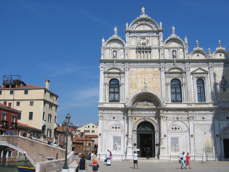 | Der Bau der Paläste und Kirchen in Venedig war durch den sandigen Untergrund recht schwierig. Man nimmt an, daß im Gebiet des heutigen Venedigs vor langer Zeit das Po-Delta mündete. Das es trügerisch ist auf Sand zu bauen, steht schon in der Bibel. Die Baumeister Venedigs gingen deshalb folgendermaßen vor. Der Grundriß des Gebäudes wurde durch Bohlen, die man in den Sand einsetzte markiert. Innerhalb der Umgrenzung wurden Holzpfähle eingerammt. Die Anzahl derer richtete sich nach dem Druck den das Gebäude auf den Untergrund ausüben würde. Das war nicht immer ganz einfach, denn es gab damals noch keine genauen Berechnungen. Auf die Pfähle kam eine Schicht Ziegel und darauf eine Schicht Marmor. Auf die Marmorunterlage konnte dann das Gebäude gebaut werden. Die Bohlen wurden später wieder entfernt, so konnte das Wasser die Holzpfähle luftdicht abschließen. |