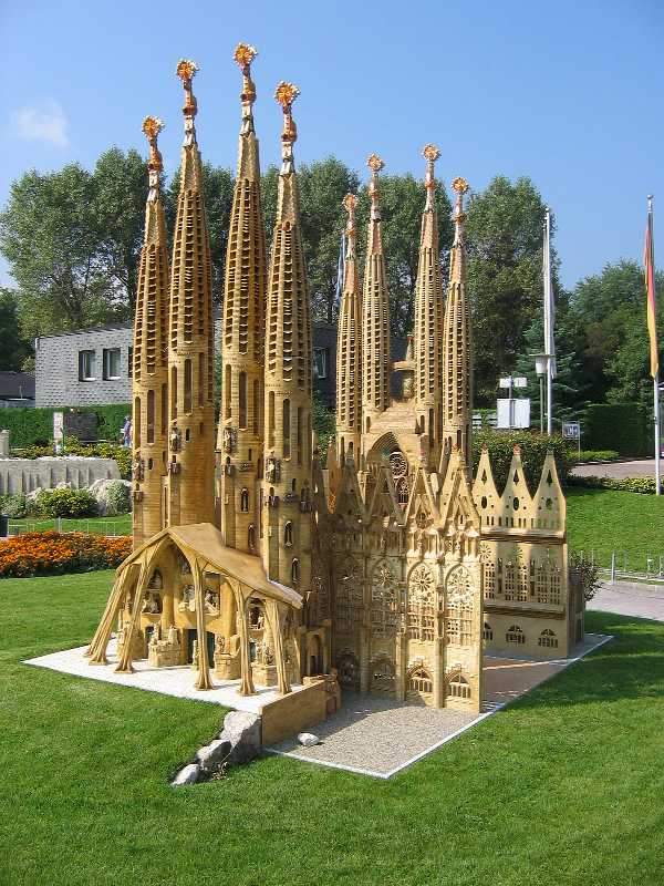Sagrada Familia, Barcelona (Spanien)): 1883 übernahm Antonio Gaudi den Auftrag zum Bau einer "Kirche der Armen" am damaligen Stadtrand von Barcelona. Da der Bau nur durch Spenden finanziert wurde ging es nicht besonders schnell voran. Außerdem änderte Gaudi häufig seine Pläne während der Arbeiten. Am 10.06.1926 starb Gaudi im Alter von 74 Jahren. Danach führte sein Schüler Sugranes das Werk fort. Geplant waren ursprünglich 12 Türme, vier auf jeder Seite. Gaudi selbst konnte die Ostfassade mit Christi Geburt fertigstellen. Die Fertigstellung der Kirche ist bis 2020 geplant. |