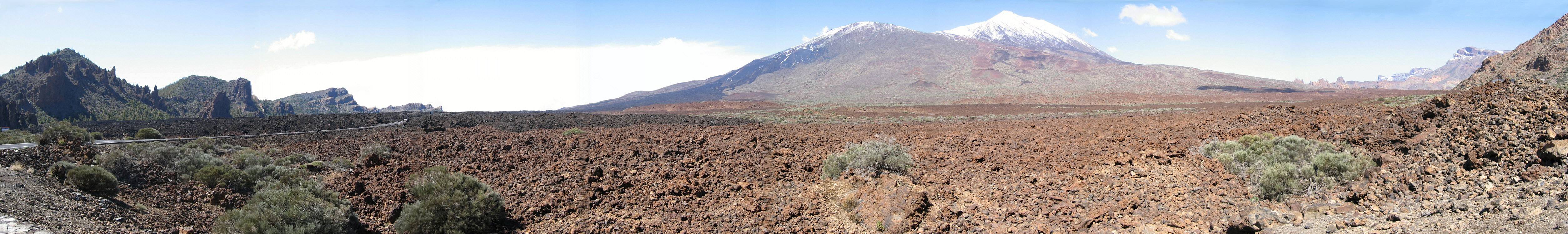 Panorama von Boca de Tauce Straße TF38 Richtung NW, Pico Viejo, Pico del Teide und Guajara